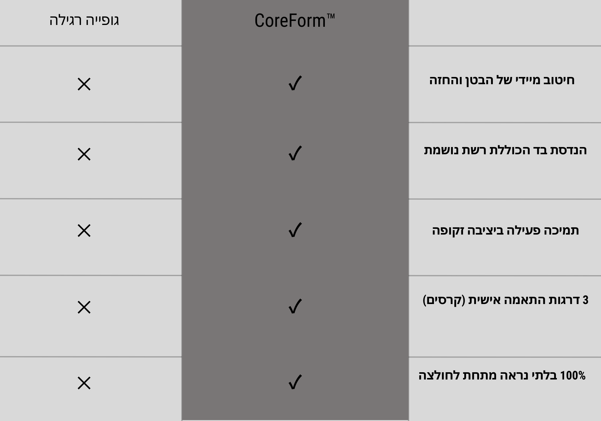 שכחו מהגופיות הרגילות שפשוט "יושבות" על הגוף. טכנולוגיית CoreForm™ מעצבת את הסילואט שלכם ומעניקה לכם באופן מיידי מראה אתלטי ומוגדר יותר. 100% בלתי נראה, 100% עוצמתי.